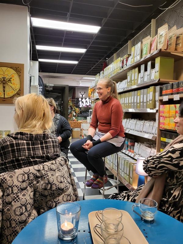 Teeletissä saimme hyviä vinkkejä eri teelaatujen valmistukseen ja pääsimme maistelemaan ihania, oikeaoppisesti haudutettuja juomia, joita emme välttämättä ilman opastusta ja testausta osaisi itse ostaa. Nuuskuttelimme useita herkullisia tuoksuja eri teepurkeista ja saimme erilaisia suosituksia. Lopuksi teimme hyviä ostoksia ja varmaan moni vielä palaa puotiin joululahjaostoksille.